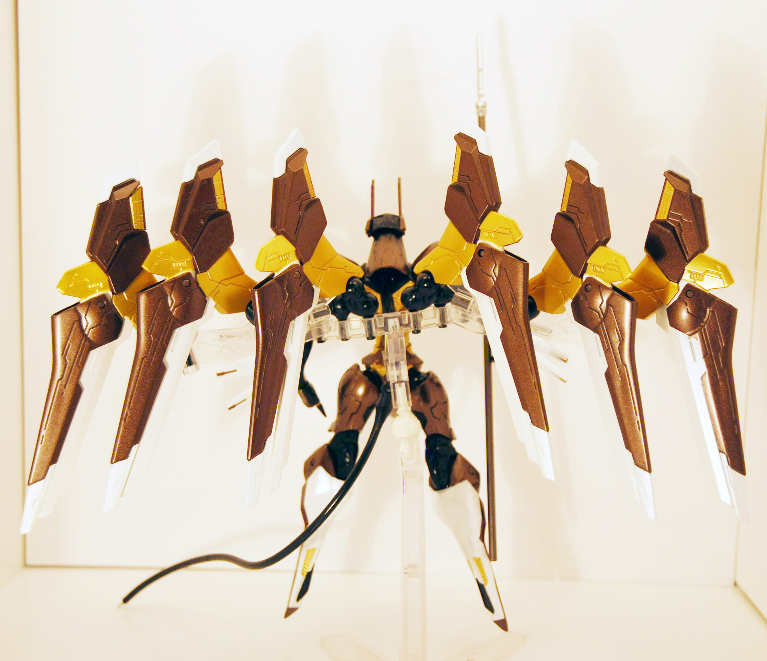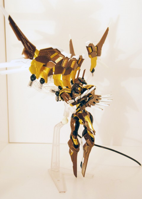 As will all Revoltechs, this figure is very poseable and multi-jointed. Whilst it lacks the ability to stand on its own, like the Jehuty figure, as well as lack any other real gimmicks, the sheer imposing nature of the design is still very striking. In the game the structures around the rear of Anubis hover in mid-air, naturally this has been recreated through use of clear plastic to link up the main figure to these “wings”. Subsequently, this affords the opportunity to wrap them around the main figure, almost cocooning it away. As with the Jehuty figure, Anubis also comes with a very serviceable stand.